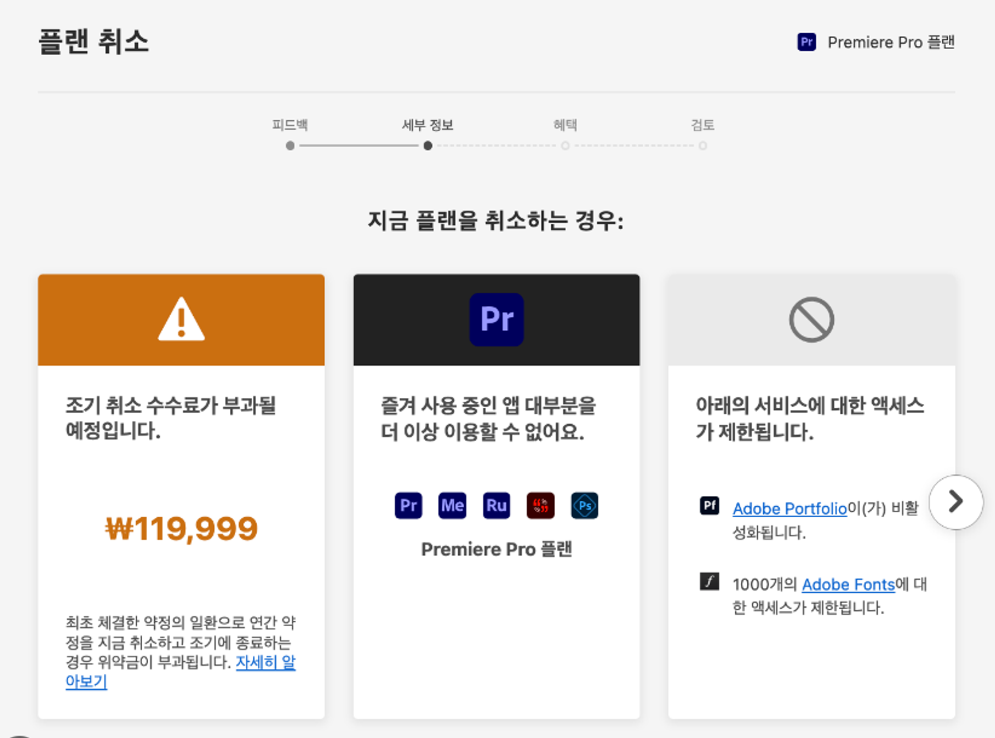 어도비 서비스 구독 해지를 위해서는 사전에 가입 당시 확실하게 안내받지 못했던 조기 취소 수수료 고지와 함께 험난한 절차를 거쳐야 한다. 개인이 아닌 기업 플랜은 해지 절차가 더욱 깐깐하다.